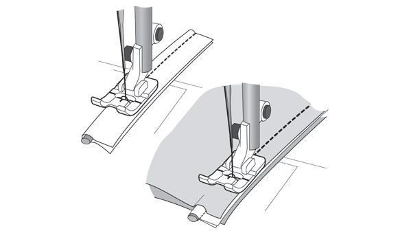 Posiziona gli strati di tessuto e cordoncino sotto il piedino per cordoncino, con il cordoncino nella scanalatura sul fondo del piedino. Cuci. La scanalatura sul fondo del piedino guida il cordoncino mentre cuci. (Consiglio: esegui delle tacche nel margine di cucitura del cordoncino lungo le curve e gli angoli.)