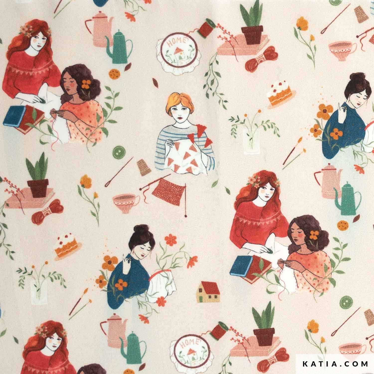 Tessuto popeline in cotone con stampa di donne che cuciono, lavorano all’uncinetto e a maglia su uno sfondo sabbia chiaro. Una stampa unica e originalissima disegnata digitalmente da Lady Desidia in esclusiva per Katia Fabrics. Il tessuto popeline in cotone Knit & Sew è perfetto per cucire accessori come borse da cucito, necessaire o borse porta lavori. Nella rivista di modelli Autunno-Inverno 22/23 Cottagecore di Katia Fabrics hai a disposizione un modello per realizzare una fantastica e pratica scatola da cucito. Siamo sicuri che apprezzerai i tuoi progetti di cucito con questo grazioso popeline!